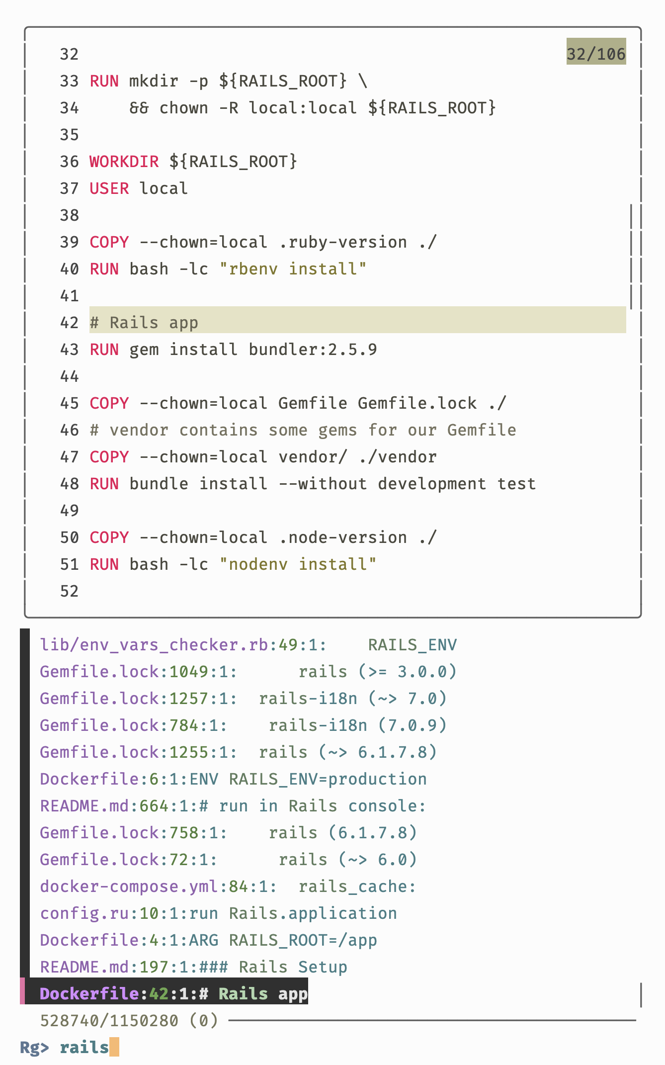 fzf is a great tool, but with another tool we can have the output of rip-grep displayed in a separate split window and by using inline preview after the file name and line number, search results can be found quicker most of the time.